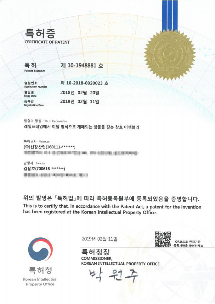 [특허증] 10-1948881 / 레일프레임에서 이탈방식으로 개폐되는 창문을 갖는 창호 어셈블리